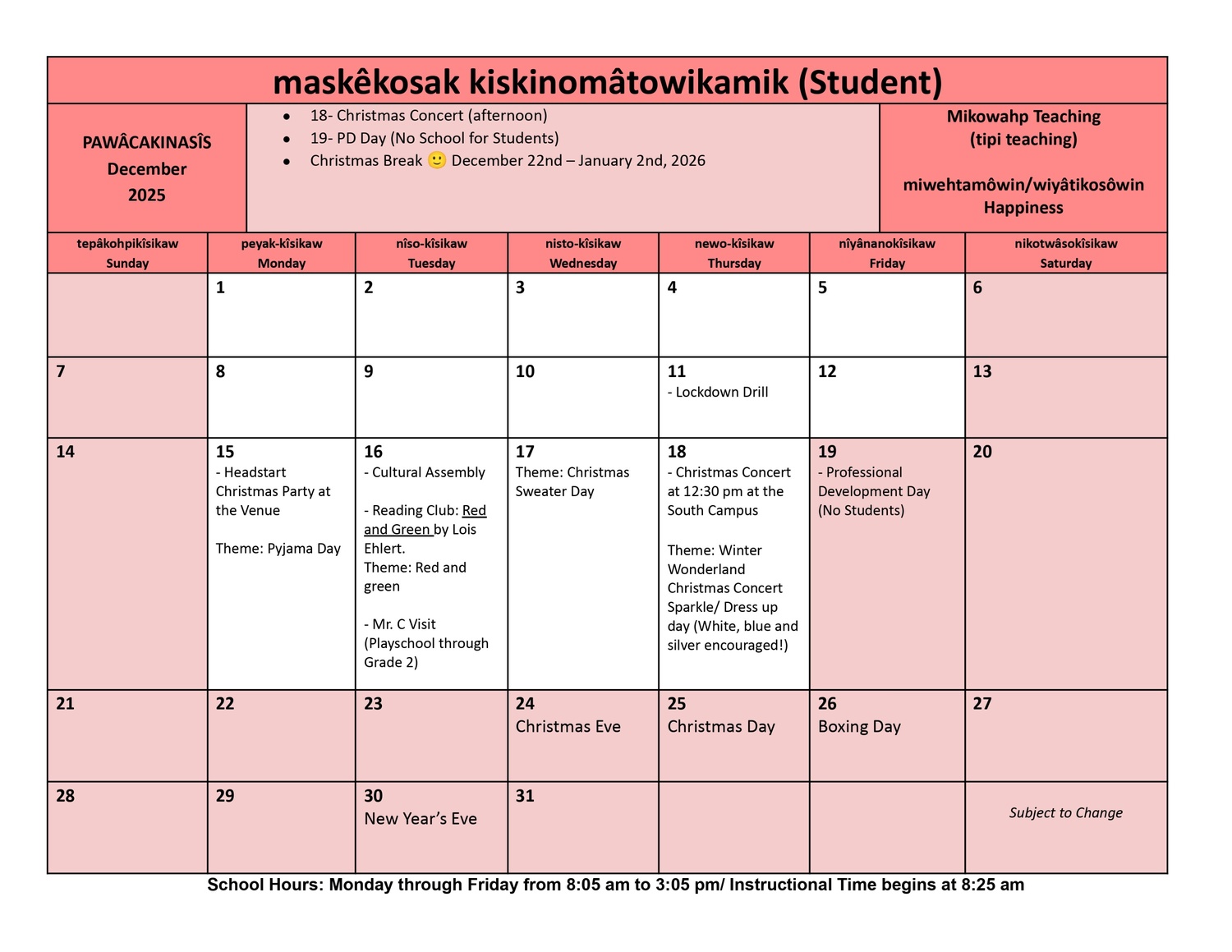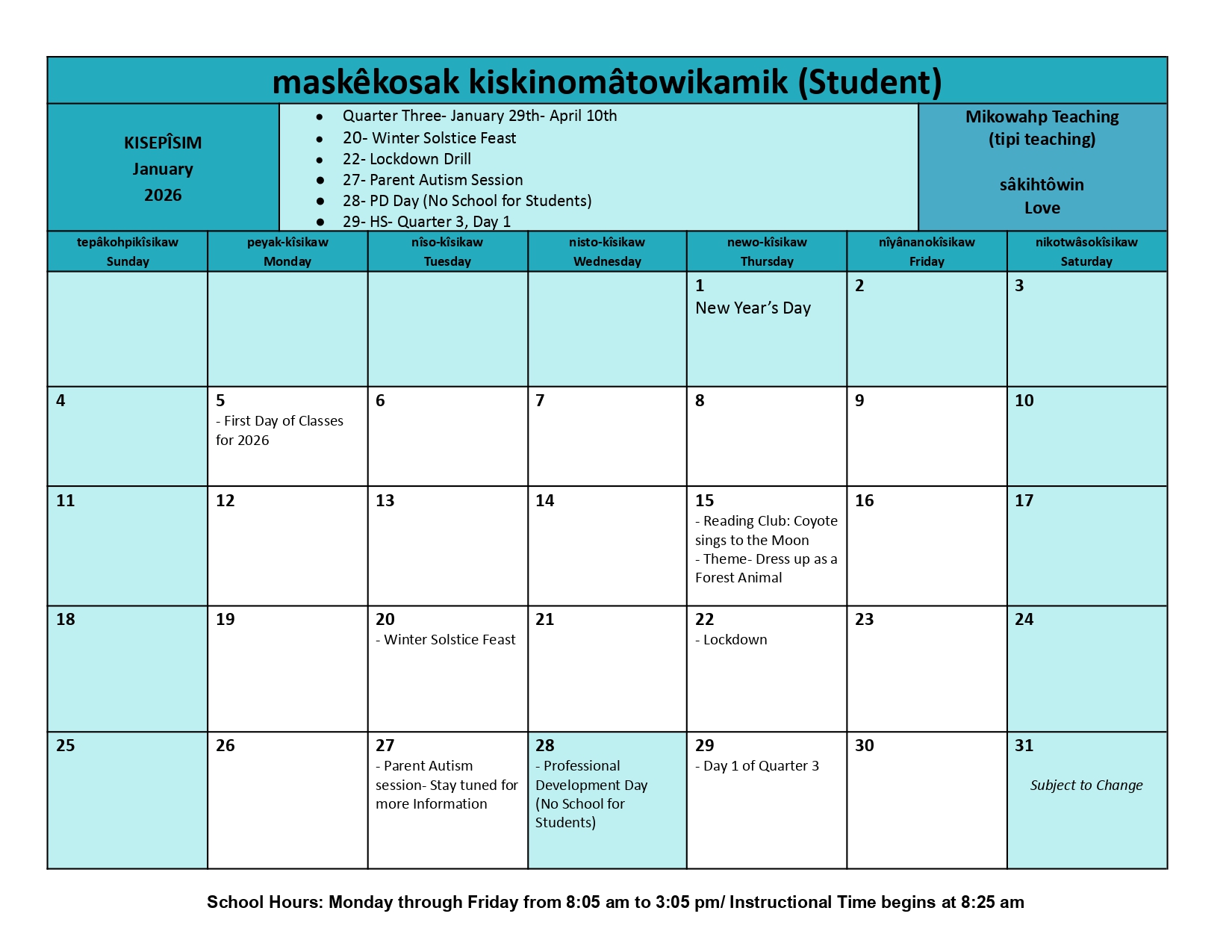 Our students will learn nêhiyawawin (Cree) language to connect them to the land, history and relationships through daily activities and learning unit development. Why? Studies have shown that students who speak the language including understanding the meanings, values and traditions have a stronger identity, more family involvement and do better in school.